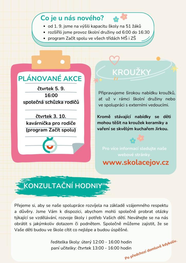 Vážení rodiče, milé děti, slavnostní zahájení nového školního roku proběhne tradičně v pondělí 2. září 2024 v tělocvičně školy. Těšíme se na vás.